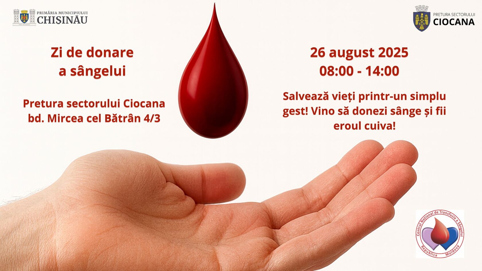 Salvează vieți printr-un simplu gest! Vino pe 26 august la Pretura sectorului Ciocana să donezi sânge și fii eroul cuiva!
